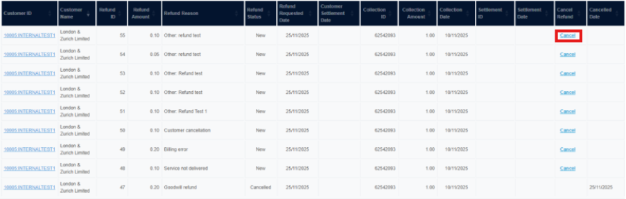 - If cancellation is available, you will see a Cancel option next to the refund. Select this to cancel the request.