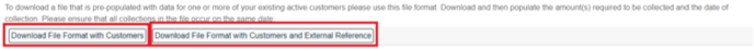 - Within the Upload Collections screen (same screen as above) you can then either select Download File Format with Customers or Download File Format with Customer and External Reference.