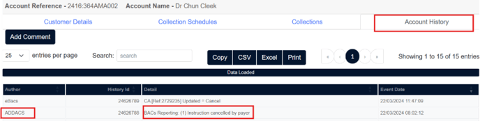 It is possible that your customer has contacted their bank to cancel their Direct Debit mandate, or that there has been a change to their bank account details. To determine the exact reason and receive guidance on the appropriate next steps, please review the “Account History” section for the relevant customer account.