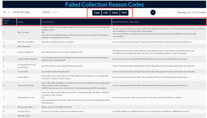 - This will then list the various failed reason codes, reason, circumstances and special instructions on how to deal with the returned reason code. You can then copy this or download as CSV, Excel or Print as PDF for your reference.